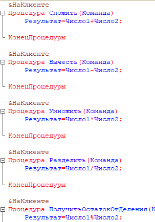 Следующая строка заканчивает процедуру словом «КонецПроцедуры». Для процедуры сложения код будет выглядеть так: