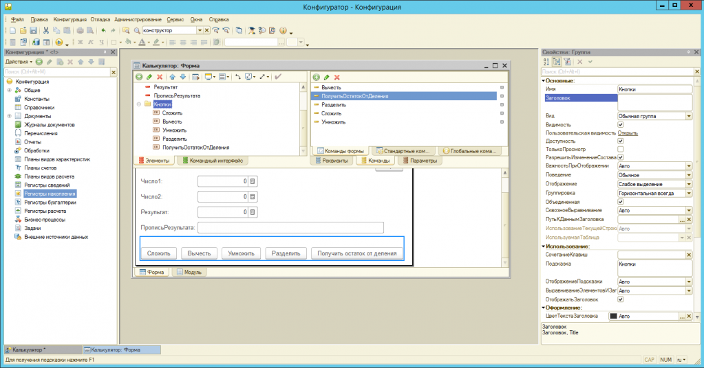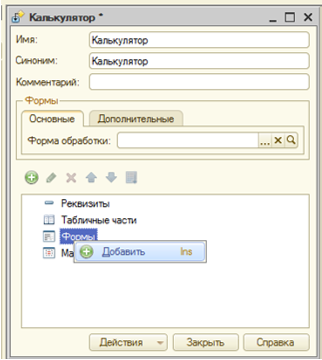 Задайте разработке имя. В данном случае «Калькулятор». Создайте новую форму через «Конструктор форм». Для этого разработайте главное окно обработки. Чтобы это сделать, нажмите правой кнопкой на «Формы», далее – «Добавить».