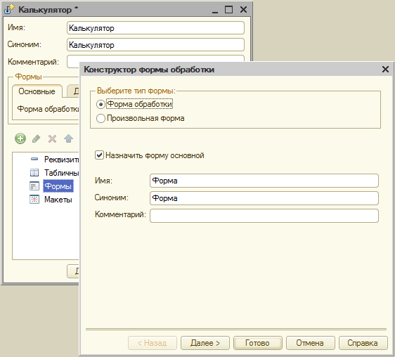 Тип формы – «Форма обработки». Имя формы можно изменить, но в данном случае делать этого необязательно. Нажмите «Готово».