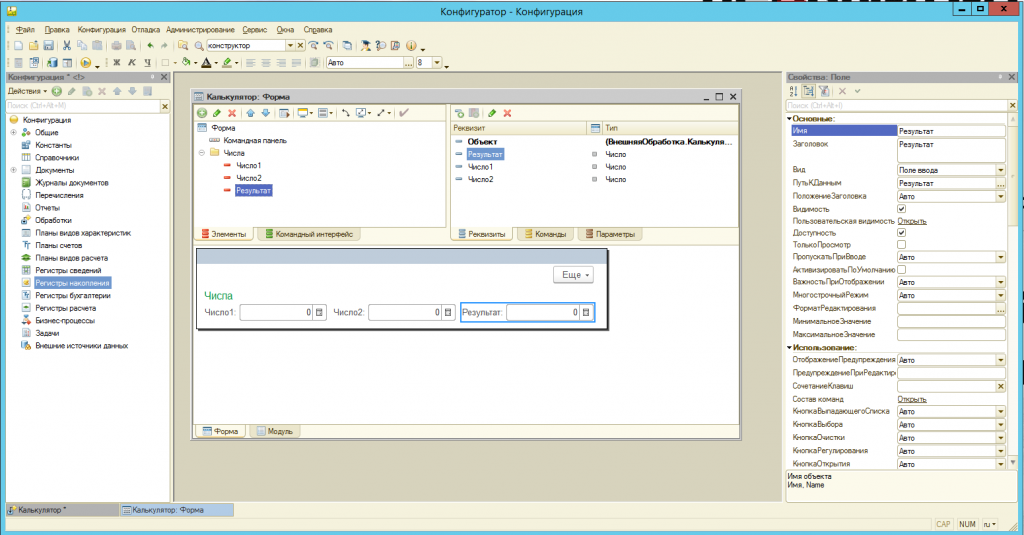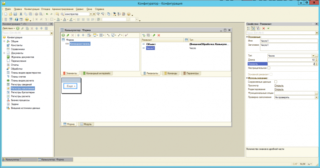 Вы увидите окно настройки формы. В правой части располагаются элементы формы, в левой – реквизиты. Внизу наглядное представление формы. В первую очередь создаете реквизит «Число1» (тип – число, длина – 10, точность – 2).